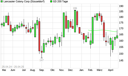 Mit dem Rücksetzer auf 166,00 EUR hat die Lancaster Colony-Aktie am 24.04.2025 die 200-Tage-Linie nach unten gekreuzt.