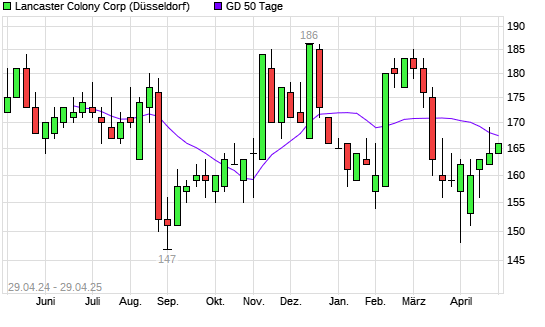 Mit dem Rücksetzer auf 164,00 EUR hat die Lancaster Colony-Aktie am 28.04.2025 die 50-Tage-Linie nach unten gekreuzt.