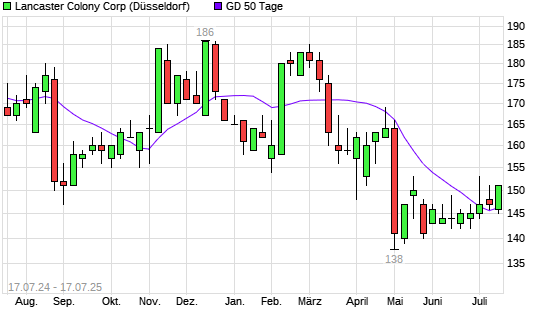 Mit dem Rücksetzer auf 146,00 EUR hat die Lancaster Colony-Aktie am 16.07.2025 die 50-Tage-Linie nach unten gekreuzt.