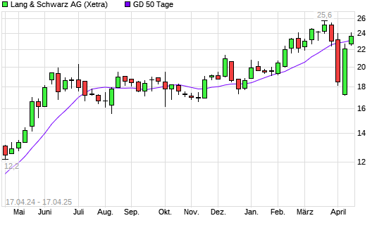 Mit dem Rücksetzer auf 23,00 EUR hat die Lang & Schwarz-Aktie am 16.04.2025 die 50-Tage-Linie nach unten gekreuzt.