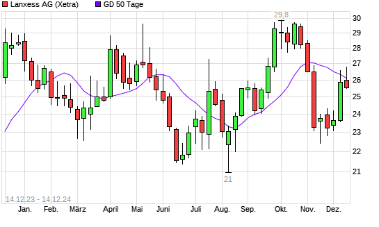 Mit dem Rücksetzer auf 26,08 EUR hat die Lanxess-Aktie am 13.12.2024 die 50-Tage-Linie nach unten gekreuzt.