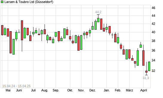 Mit dem Rücksetzer auf 30,80 EUR hat die Larsen & Toubro-Aktie (ISIN USY5217N1183) am 14.04.2025 ein neues 12-Monats-Tief erreicht und damit den Kurs vom 09.04.2025 eingestellt.