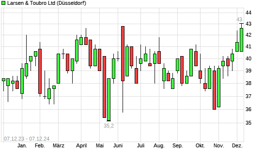 Mit dem Anstieg auf 42,80 EUR hat die Larsen & Toubro-Aktie (ISIN USY5217N1183) am 06.12.2024 ein neues 6-Monats-Hoch erreicht und damit den Kurs vom 29.11.2024 eingestellt.