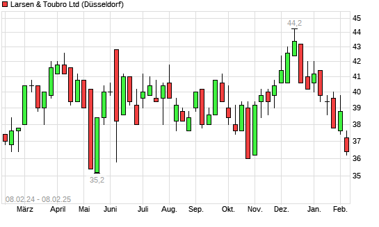 Mit dem Rücksetzer auf 36,00 EUR hat die Larsen & Toubro-Aktie (ISIN USY5217N1183) am 07.02.2025 ein neues 6-Monats-Tief erreicht und damit den Kurs vom 25.10.2024 eingestellt.