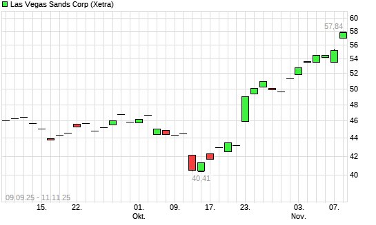 Mit dem Anstieg auf 57,14 EUR hat die Las Vegas Sands-Aktie (ISIN US5178341070) am 10.11.2025 ein neues 12-Monats-Hoch erreicht und damit den Kurs vom 07.11.2025 eingestellt.