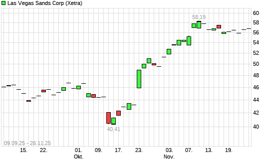 Mit dem Anstieg auf 58,27 EUR hat die Las Vegas Sands-Aktie (ISIN US5178341070) am 25.11.2025 ein neues 5-Jahres-Hoch erreicht und damit den Kurs vom 11.11.2025 eingestellt.