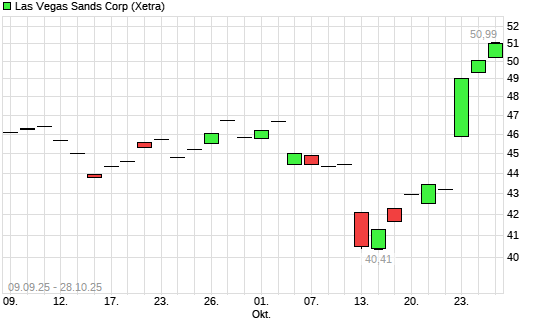 Mit dem Anstieg auf 50,84 EUR hat die Las Vegas Sands-Aktie (ISIN US5178341070) am 27.10.2025 ein neues 6-Monats-Hoch erreicht und damit den Kurs vom 28.08.2025 eingestellt.