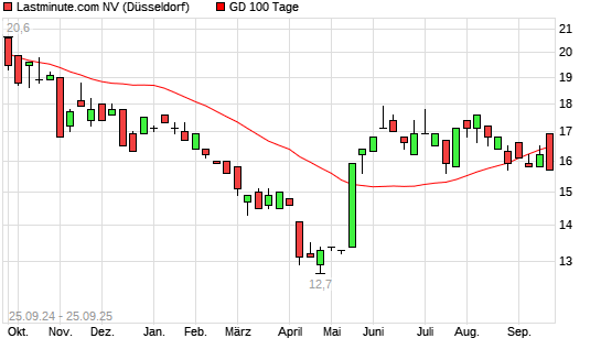 Mit dem Rücksetzer auf 16,30 EUR hat die Lastminute.com-Aktie am 24.09.2025 die 100-Tage-Linie nach unten gekreuzt.