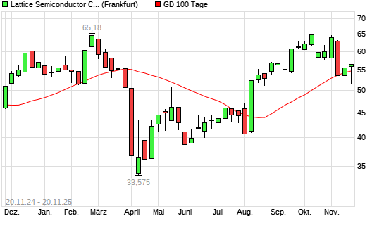 Mit dem Anstieg auf 56,55 EUR hat die Lattice Semiconductor-Aktie am 19.11.2025 die 100-Tage-Linie nach oben gekreuzt.