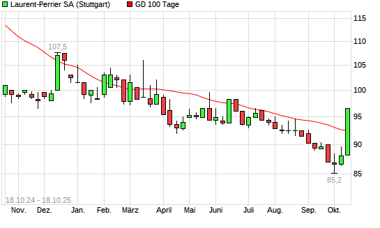 Mit dem Anstieg auf 94,00 EUR hat die Laurent-Perrrier-Aktie am 17.10.2025 die 100-Tage-Linie nach oben gekreuzt.