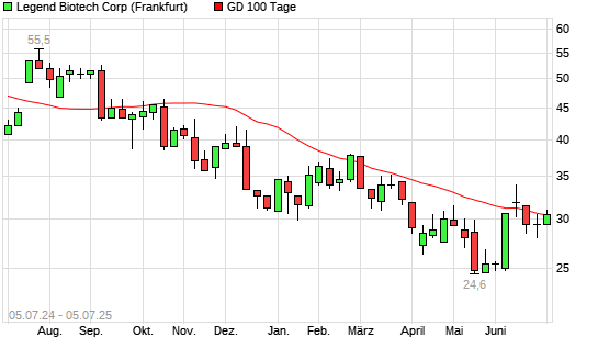 Mit dem Rücksetzer auf 30,40 EUR hat die Legend Biotech Corp-Aktie am 04.07.2025 die 100-Tage-Linie nach unten gekreuzt.