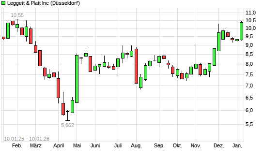 Mit dem Anstieg auf 10,20 EUR hat die Leggett & Platt-Aktie (ISIN US5246601075) am 09.01.2026 ein neues 6-Monats-Hoch erreicht und damit den Kurs vom 02.12.2025 eingestellt.