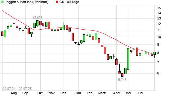 Mit dem Rücksetzer auf 7,48 EUR hat die Leggett & Platt-Aktie am 01.07.2025 die 100-Tage-Linie nach unten gekreuzt.