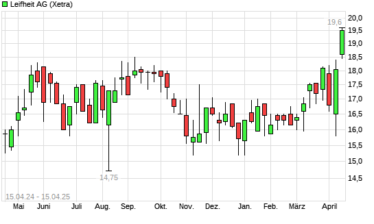 Mit dem Anstieg auf 19,50 EUR hat die Leifheit-Aktie (ISIN DE0006464506) am 14.04.2025 ein neues 12-Monats-Hoch erreicht und damit den Kurs vom 11.04.2025 eingestellt.