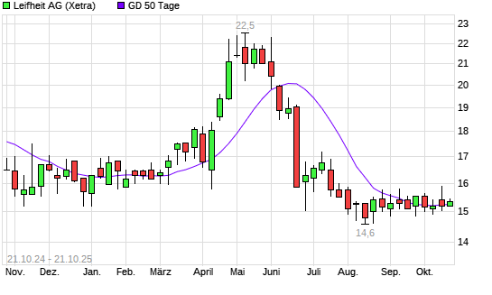 Mit dem Anstieg auf 15,25 EUR hat die Leifheit-Aktie am 20.10.2025 die 50-Tage-Linie nach oben gekreuzt.Die Leifheit-Aktie befindet sich seit dem 19.06.2025 im langfristigen Abwärtstrend und ...weiterlesen