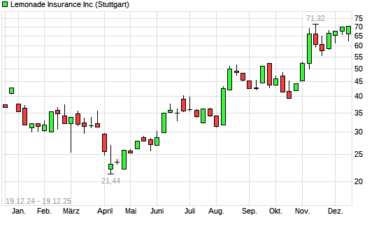 Mit dem Anstieg auf 70,72 EUR hat die Lemonade-Aktie (ISIN US52567D1072) am 18.12.2025 ein neues 3-Jahres-Hoch erreicht und damit den Kurs vom 11.12.2025 eingestellt.