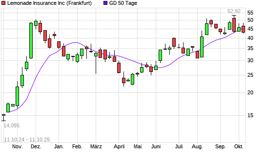 Mit dem Rücksetzer auf 41,99 EUR hat die Lemonade-Aktie am 10.10.2025 die 50-Tage-Linie nach unten gekreuzt.