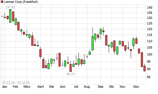 Mit dem Rücksetzer auf 88,80 EUR hat die Lennar-Aktie (ISIN US5260571048) am 23.12.2025 ein neues 6-Monats-Tief erreicht und damit den Kurs vom 23.06.2025 eingestellt.