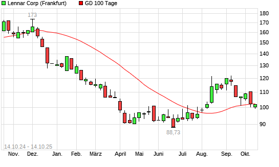 Mit dem Rücksetzer auf 101,36 EUR hat die Lennar-Aktie am 13.10.2025 die 100-Tage-Linie nach unten gekreuzt.