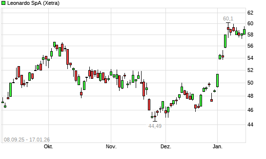 Mit dem Anstieg auf 59,16 EUR hat die Leonardo-Aktie (ISIN IT0003856405) am 16.01.2026 ein neues All-Time-High erreicht und damit den Kurs vom 13.01.2026 eingestellt.