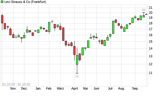 Mit dem Anstieg auf 19,74 EUR hat die Levi Strauss & Co-Aktie (ISIN US52736R1023) am 30.09.2025 ein neues 12-Monats-Hoch erreicht und damit den Kurs vom 25.09.2025 eingestellt.