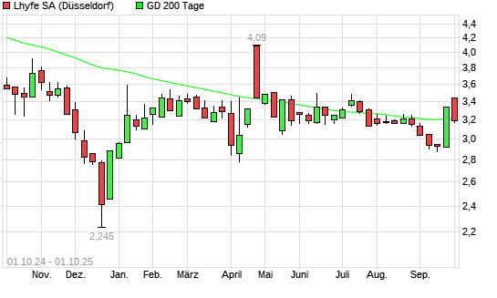 Mit dem Rücksetzer auf 3,24 EUR hat die Lhyfe-Aktie am 30.09.2025 die 200-Tage-Linie nach unten gekreuzt.
