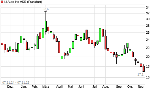 Mit dem Rücksetzer auf 17,30 EUR hat die Li Auto-Aktie (ISIN US50202M1027) am 06.11.2025 ein neues 12-Monats-Tief erreicht und damit den Kurs vom 04.11.2025 eingestellt.