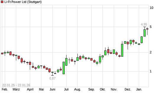 Mit dem Anstieg auf 4,81 EUR hat die Li-Ft Power-Aktie (ISIN CA53000A1066) am 21.01.2026 ein neues 12-Monats-Hoch erreicht und damit den Kurs vom 15.01.2026 eingestellt.