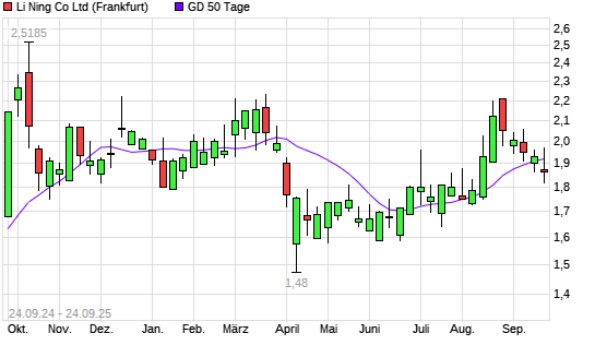 Mit dem Rücksetzer auf 1,89 EUR hat die Li Ning Co-Aktie am 23.09.2025 die 50-Tage-Linie nach unten gekreuzt.Die Li Ning Co-Aktie befindet sich seit dem 14.08.2025 im langfristigen Aufwärtstrend ...weiterlesen