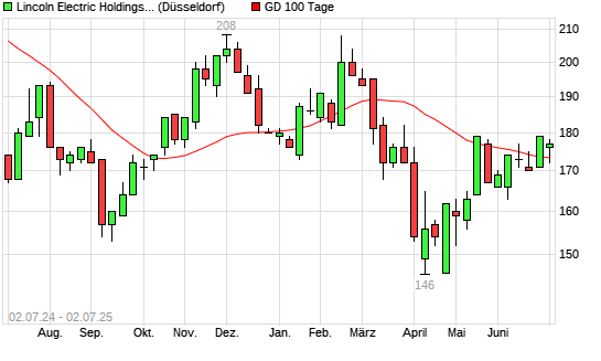 Mit dem Rücksetzer auf 173,00 EUR hat die Lincoln Electric-Aktie am 01.07.2025 die 100-Tage-Linie nach unten gekreuzt.