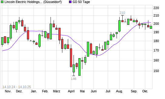 Mit dem Rücksetzer auf 197,00 EUR hat die Lincoln Electric-Aktie am 13.10.2025 die 50-Tage-Linie nach unten gekreuzt.