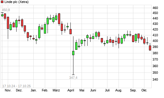 Mit dem Rücksetzer auf 378,00 EUR hat die Linde PLC-Aktie (ISIN IE000S9YS762) am 16.10.2025 ein neues 12-Monats-Tief erreicht und damit den Kurs vom 08.04.2025 eingestellt.