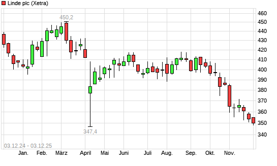 Mit dem Rücksetzer auf 349,00 EUR hat die Linde PLC-Aktie (ISIN IE000S9YS762) am 02.12.2025 ein neues 12-Monats-Tief erreicht und damit den Kurs vom 27.11.2025 eingestellt.