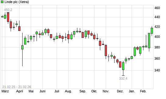 Mit dem Anstieg auf 420,00 EUR hat die Linde PLC-Aktie (ISIN IE000S9YS762) am 20.02.2026 ein neues 6-Monats-Hoch erreicht und damit den Kurs vom 27.08.2025 eingestellt.