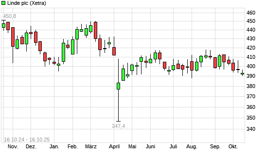 Mit dem Rücksetzer auf 387,40 EUR hat die Linde PLC-Aktie (ISIN IE000S9YS762) am 15.10.2025 ein neues 6-Monats-Tief erreicht und damit den Kurs vom 10.10.2025 eingestellt.