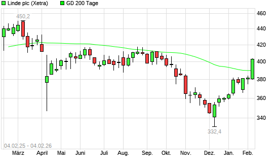 Mit dem Anstieg auf 392,80 EUR hat die Linde PLC-Aktie am 03.02.2026 die 200-Tage-Linie nach oben gekreuzt.
