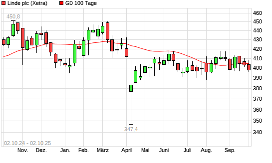 Mit dem Rücksetzer auf 398,20 EUR hat die Linde PLC-Aktie am 01.10.2025 die 100-Tage-Linie nach unten gekreuzt.