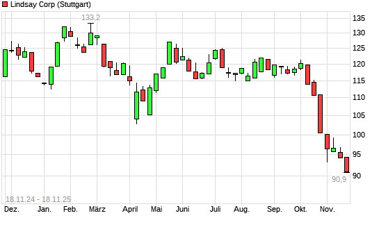 Mit dem Rücksetzer auf 91,70 EUR hat die Lindsay-Aktie (ISIN US5355551061) am 17.11.2025 ein neues 3-Jahres-Tief erreicht und damit den Kurs vom 28.10.2025 eingestellt.