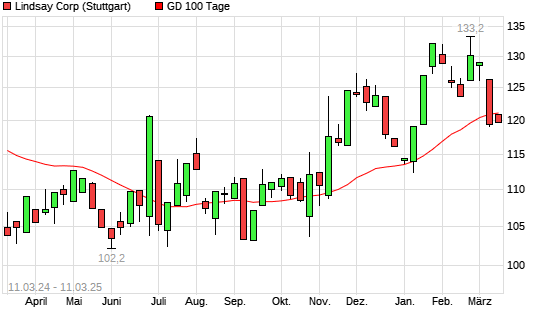 Mit dem Rücksetzer auf 119,10 EUR hat die Lindsay-Aktie am 10.03.2025 die 100-Tage-Linie nach unten gekreuzt.