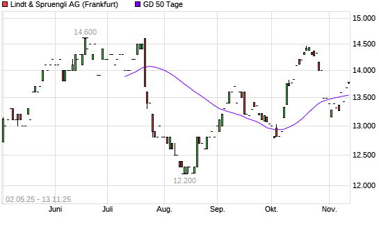 Mit dem Anstieg auf 13.680,00 EUR hat die Lindt & Sprüngli Partizipationsschein-Aktie am 12.11.2025 die 50-Tage-Linie nach oben gekreuzt.
