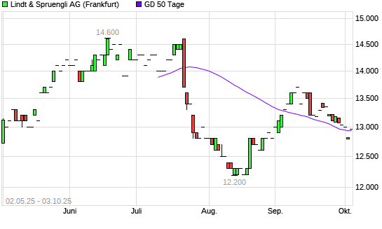 Mit dem Rücksetzer auf 12.820,00 EUR hat die Lindt & Sprüngli Partizipationsschein-Aktie am 02.10.2025 die 50-Tage-Linie nach unten gekreuzt.