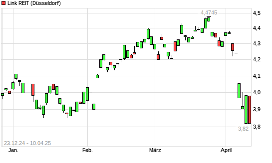 Mit dem Rücksetzer auf 3,83 EUR hat die Link REIT-Aktie (ISIN HK0823032773) am 09.04.2025 ein neues 6-Monats-Tief erreicht und damit den Kurs vom 24.01.2025 eingestellt.
