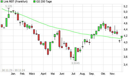 Mit dem Anstieg auf 4,19 EUR hat die Link REIT-Aktie am 29.11.2024 die 200-Tage-Linie nach oben gekreuzt.