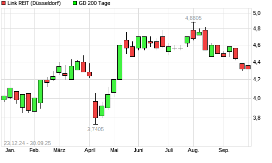 Mit dem Anstieg auf 4,45 EUR hat die Link REIT-Aktie am 29.09.2025 die 200-Tage-Linie nach oben gekreuzt.