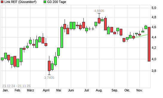 Mit dem Rücksetzer auf 4,29 EUR hat die Link REIT-Aktie am 20.11.2025 die 200-Tage-Linie nach unten gekreuzt.