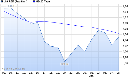 Mit dem Rücksetzer auf 4,02 EUR hat die Link REIT-Aktie am 07.01.2025 die 20-Tage-Linie nach unten gekreuzt.Die Link REIT-Aktie befindet sich seit dem 17.12.2024 im langfristigen Abwärtstrend ...weiterlesen