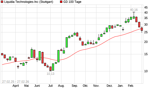 Mit dem Rücksetzer auf 25,78 EUR hat die Liquidia Technologies-Aktie am 26.02.2026 die 100-Tage-Linie nach unten gekreuzt.