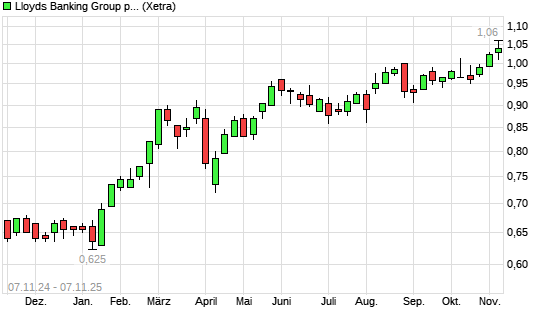 Mit dem Anstieg auf 1,05 EUR hat die Lloyds-Aktie (ISIN GB0008706128) am 06.11.2025 ein neues 10-Jahres-Hoch erreicht und damit den Kurs vom 31.10.2025 eingestellt.