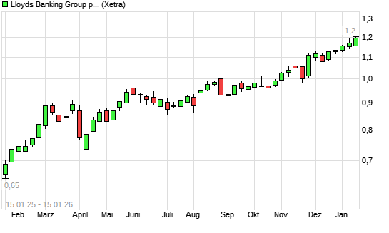 Mit dem Anstieg auf 1,19 EUR hat die Lloyds-Aktie (ISIN GB0008706128) am 14.01.2026 ein neues 10-Jahres-Hoch erreicht und damit den Kurs vom 12.01.2026 eingestellt.