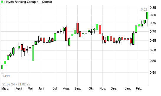 Mit dem Anstieg auf 0,79 EUR hat die Lloyds-Aktie (ISIN GB0008706128) am 20.02.2025 ein neues 5-Jahres-Hoch erreicht und damit den Kurs vom 17.02.2025 eingestellt.